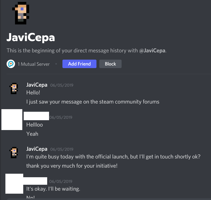 개발자는 디스코드의 링크를 줬고 그곳에서 개발자와 DM을 하며 연락하다가 Reventure의 공식 디스코드에 들어가서 작업을 하기 시작했다.